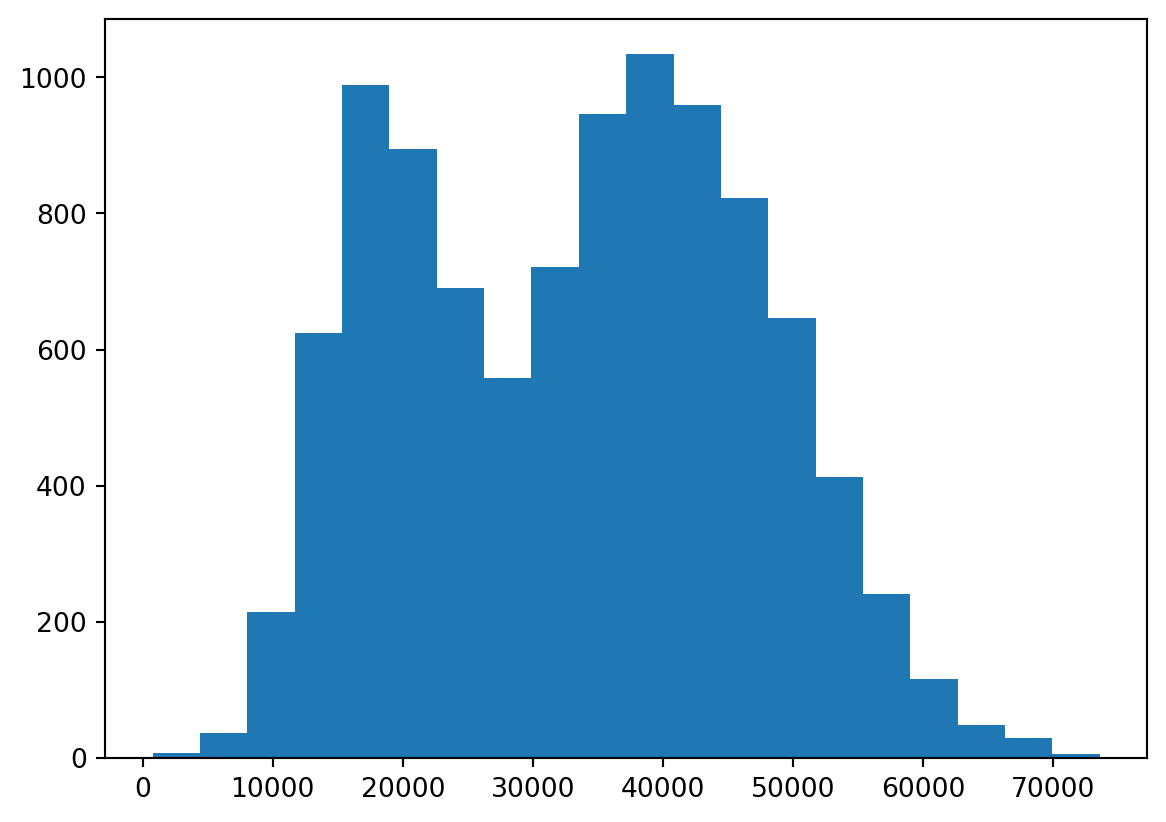 plt.hist(default["income"], bins = 20);
