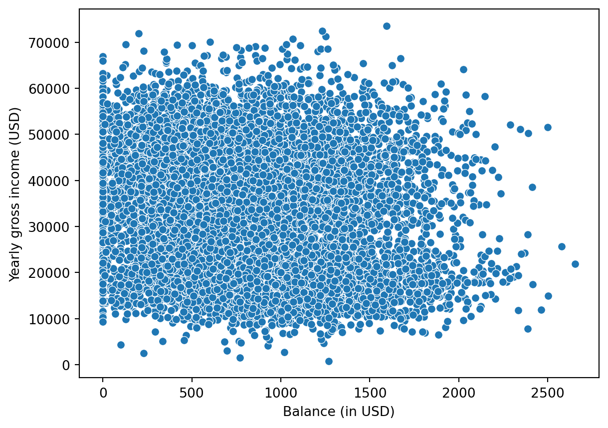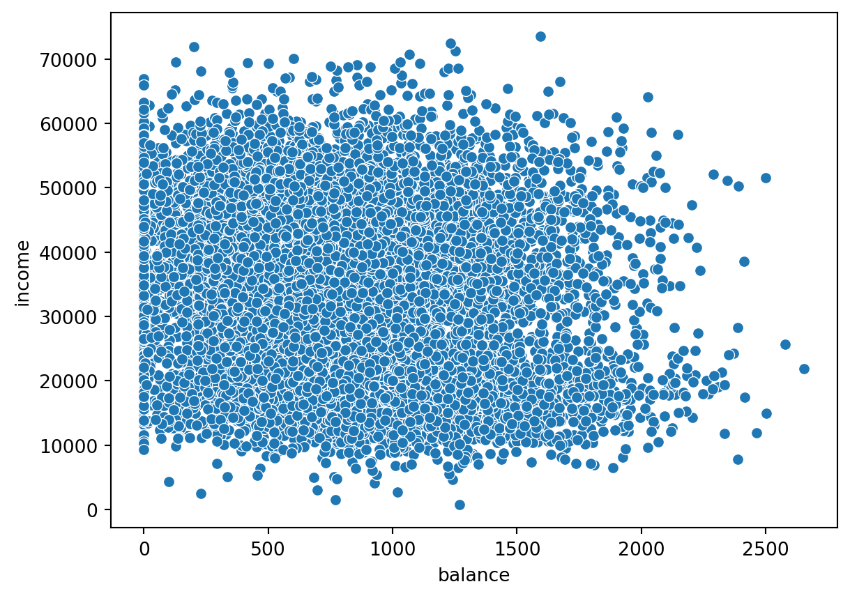 Scatterplots are useful when you want to visualize the dependence structure of two continous variables, say balance and income in the default dataset.