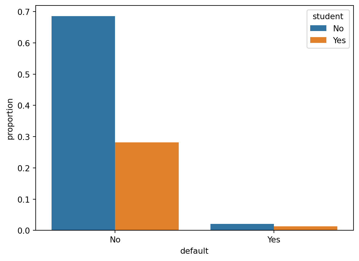 Bar plots is a very useful way of visualizing counts or frequencies. Most graphical functions also allow you to split the plots by some grouping variable using different colors. This is done using the hue argument. In this case, we want to show the frequency of people that defaulted (default = “Yes”) or not (“No”), coloring the bars by their student status (“Yes” = student, “No” = nonstudent).