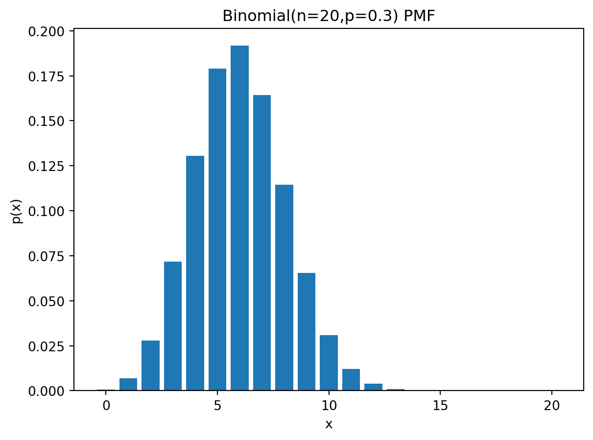 The PMF of a Possion distributed variable X is given by \[ p(x)= P(X = x) = \binom{n}{x} p^{x} (1-p)^{\,n-x}, \qquad x = 0,1,\ldots,n, \] where \(\binom{n}{k}\) is the binomial coefficient, defined by \[ \binom{n}{k} = \frac{n!}{k!\,(n-k)!}. \] Hence, the cumulative distribution function is