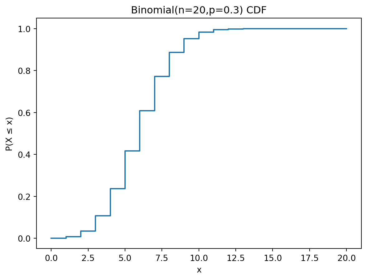 \[ F(x) = P(X\le x)=\sum_{k=0}^{\lfloor x \rfloor} \binom{n}{k} p^{k} (1-p)^{\,n-k}, \quad 0\le x\le n. \] Note the use of \(\lfloor x \rfloor\), which means rounding \(x\) to nearest integer. This allows us to define the CDF for a contious \(x\), even though the PMF only is defined for integer values. This makes the CDF a step function.