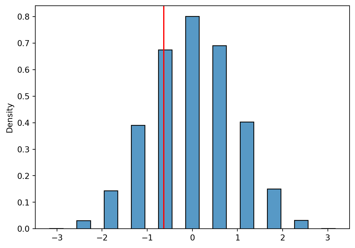 np.random.seed(12345)import seaborn as snsimport matplotlib.pyplot as pltsample_size =10count =4phat = stats.binom.rvs(n=sample_size, p =0.5, size =10000)/sample_sizez = (phat-0.5)/np.sqrt(0.5*0.5/sample_size)z_stat = (count/sample_size -0.5)/np.sqrt(0.5*0.5/sample_size)sns.histplot(z, binwidth =.3, stat ="density")plt.axvline(x=z_stat, color ="red")plt.show()print("Statistic: ", np.round(z_stat,3),"\nNumber exceeding: ", (z>z_stat).sum(),"\nPercentage: ", np.round((z>z_stat).mean()*100,3),"%")