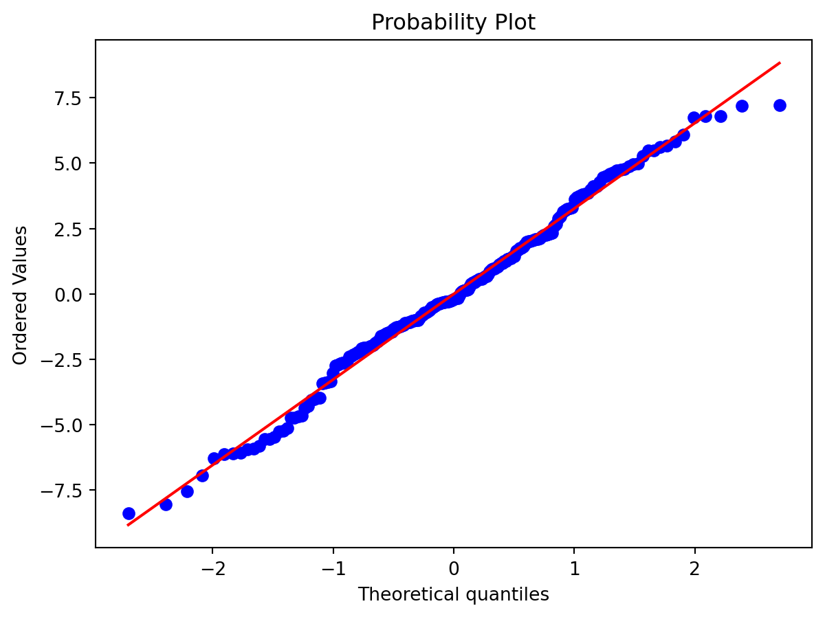 Ideally, the histogram should match the red line representing the normal distribution. It is not a perfect match, but this may be hard to assess, since the histogram depends heavily on the bins.