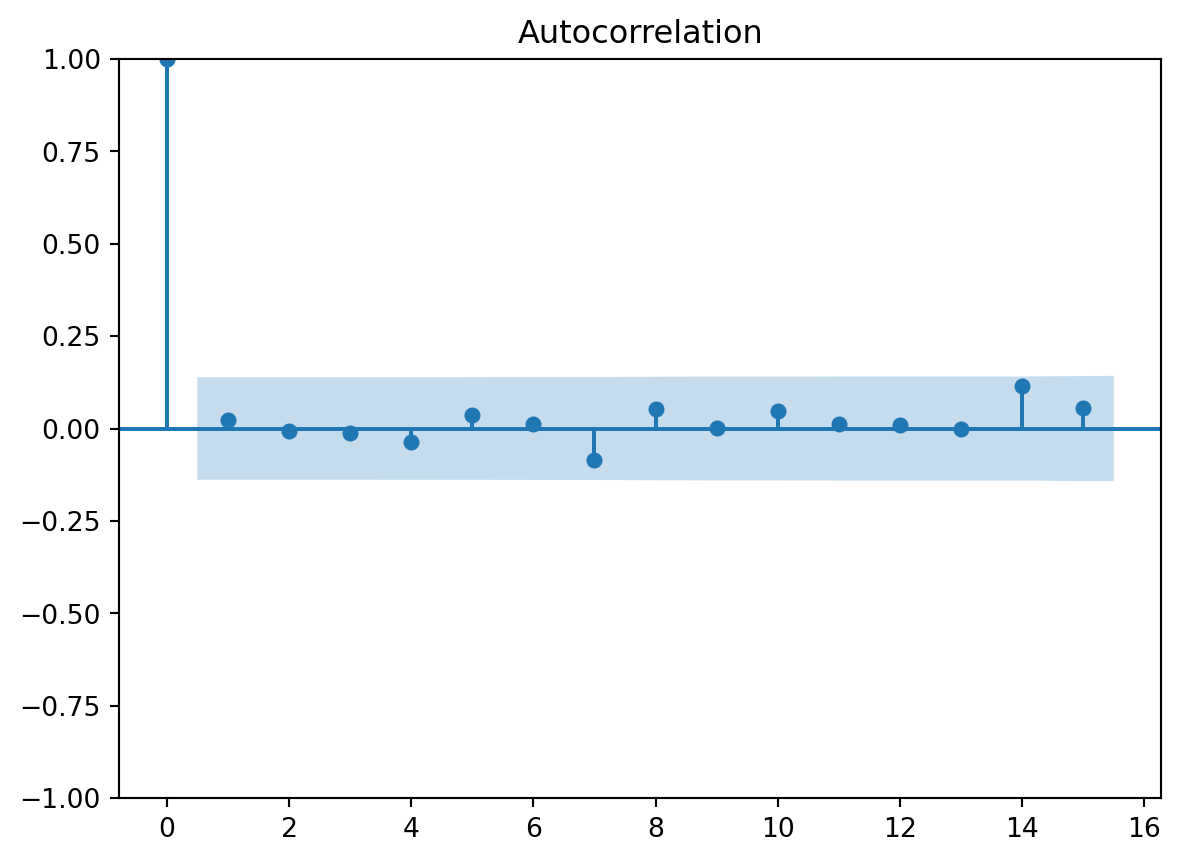from statsmodels.graphics.tsaplots import plot_acfplot_acf(ols_result.resid, lags=15)plt.show()