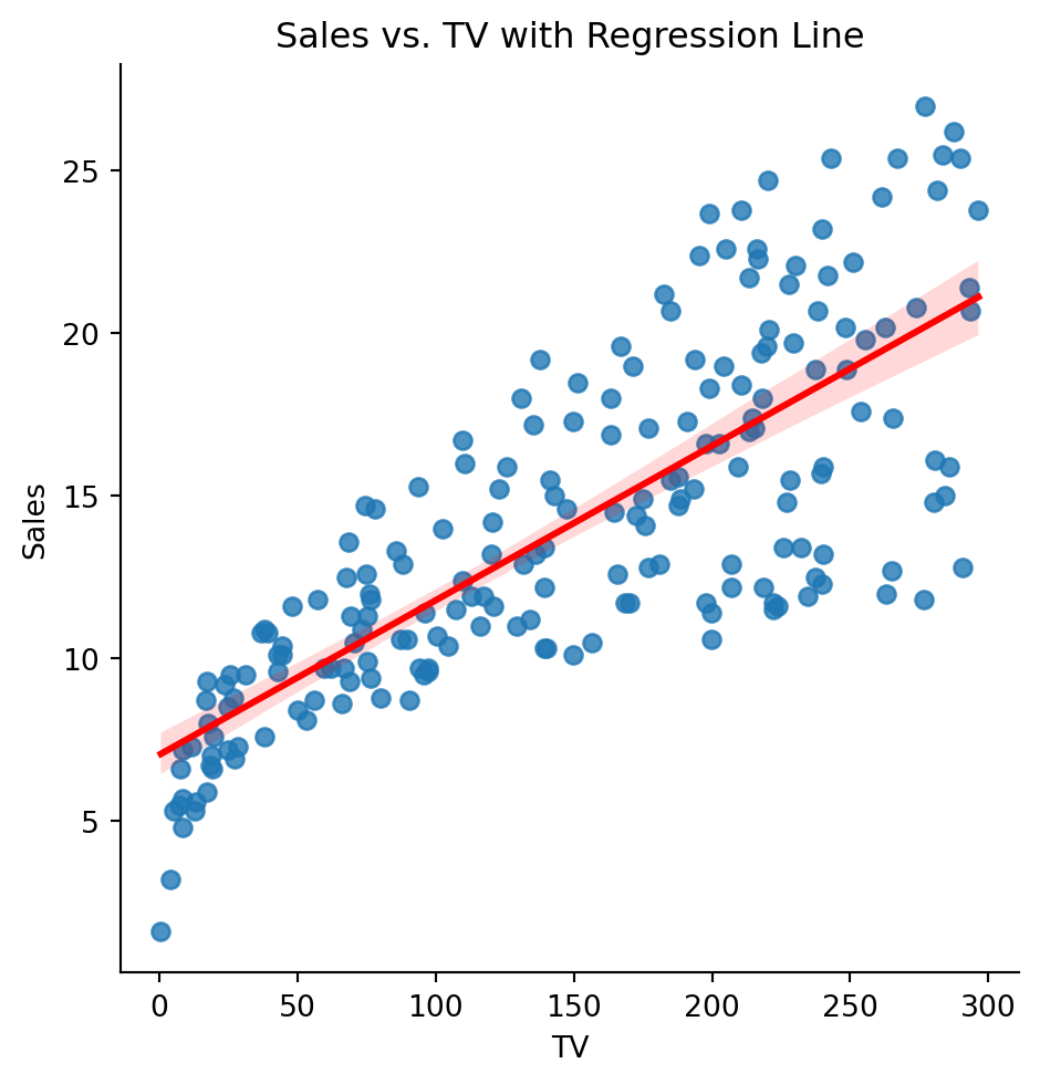 sns.lmplot(x="TV", y="Sales", data=ad,line_kws={"color": "red"})plt.title("Sales vs. TV with Regression Line")plt.show()