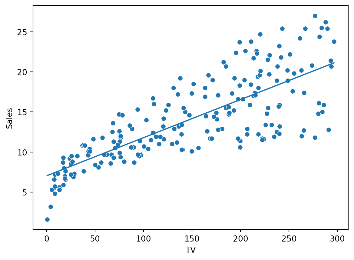 sns.scatterplot(x="TV", y ="Sales", data=ad)sns.lineplot(x=ad["TV"], y = ols_result.fittedvalues)plt.show()