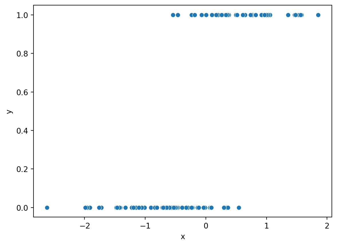 from scipy.stats import norm, binomimport pandas as pdimport numpy as npimport seaborn as snsimport matplotlib.pyplot as pltnp.random.seed(42)x = norm.rvs(size=100)# Linear termlinear_pred =0.5-5* x# Convert to probabilities using the logistic functionp =1/ (1+ np.exp(linear_pred))# Simulate binary response y from a binomial distribution (n=1 trials each)y = binom.rvs(n=1, p=p)df = pd.DataFrame({'x': x, 'y': y})sns.scatterplot(x="x", y="y", data=df)plt.show()