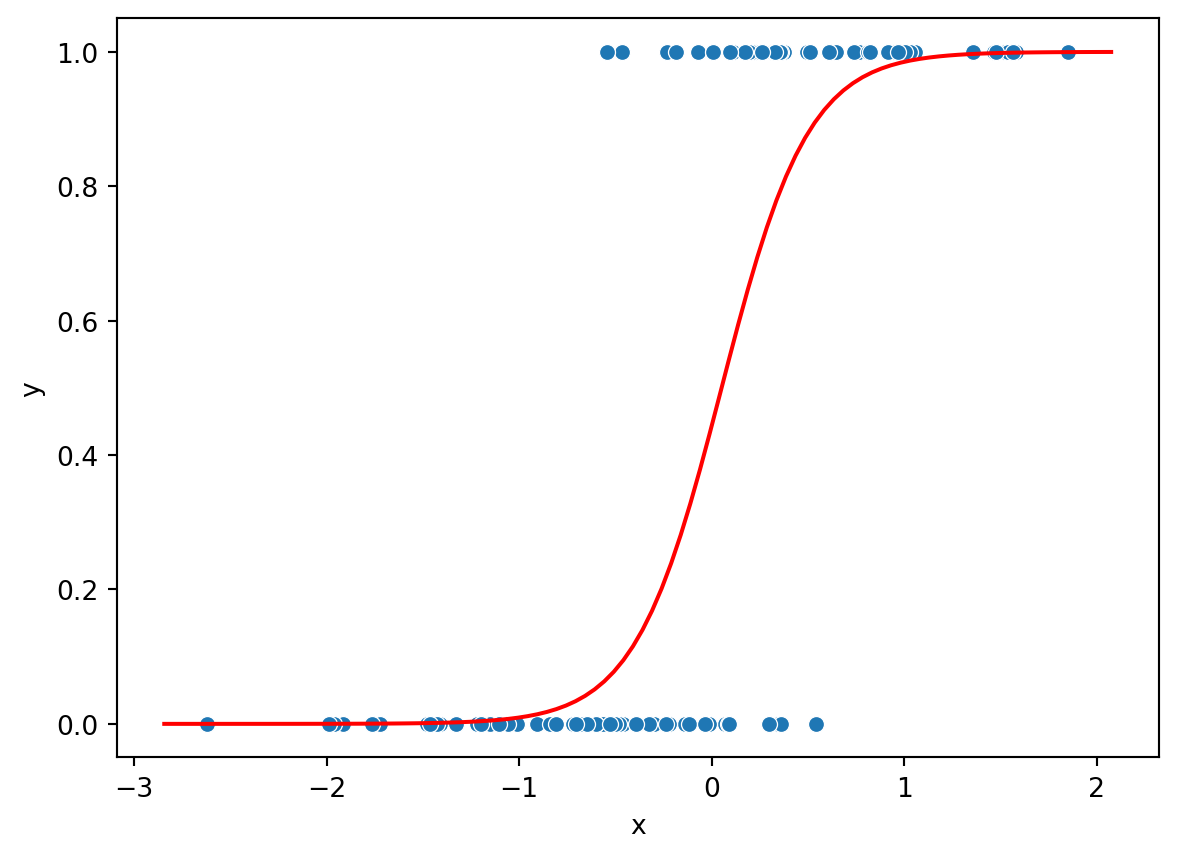 # Fit logistic regression:import statsmodels.formula.api as smmodel = sm.logit('y ~ x', data=df)result = model.fit()print(result.summary())
