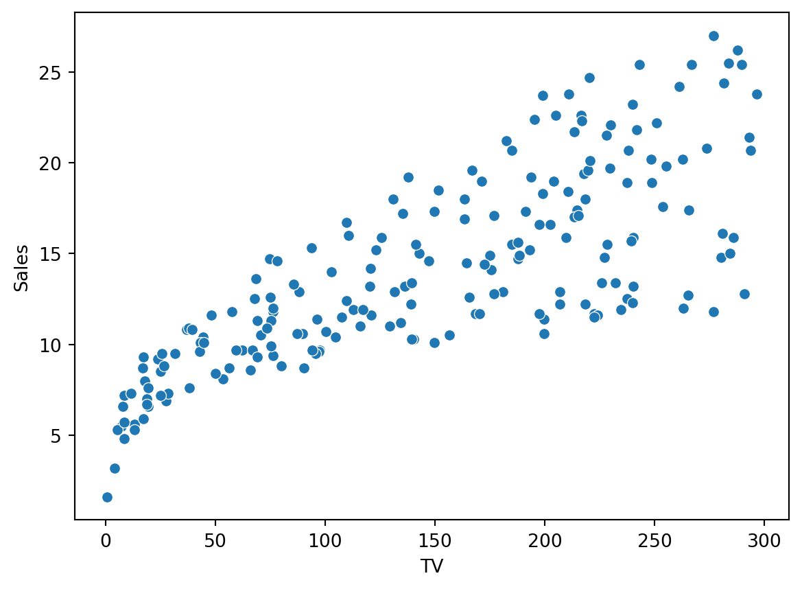 import pandas as pdfrom scipy import statsfrom statsmodels.formula.api import olsimport numpy as npimport seaborn as snsimport matplotlib.pyplot as plturl = ("https://raw.githubusercontent.com/nguyen-toan/""ISLR/refs/heads/master/dataset/Advertising.csv")ad = pd.read_csv(url)print(ad.columns)sns.scatterplot(x="TV",y="Sales", data=ad)plt.show()