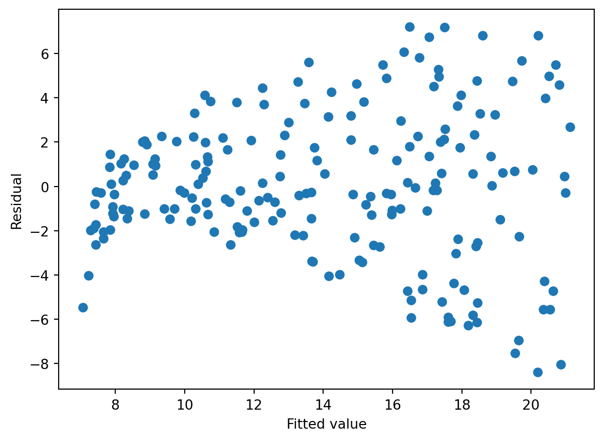 import matplotlib.pyplot as pltplt.scatter(ols_result.fittedvalues, ols_result.resid)plt.xlabel('Fitted value')plt.ylabel('Residual')plt.show()