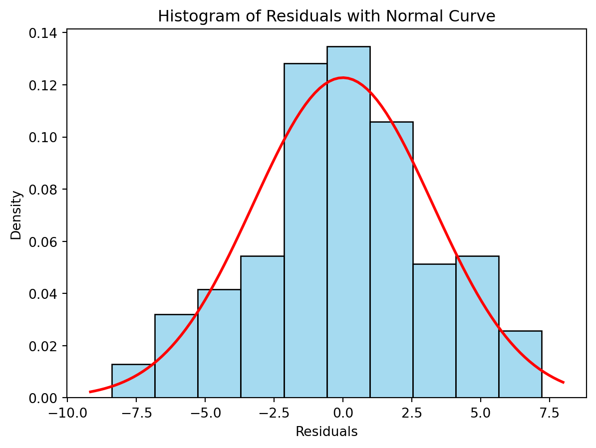 sns.histplot(ols_result.resid, kde=False, stat='density',bins=10, color='skyblue', edgecolor='black')# Plot normal distribution curvemu, std = ols_result.resid.mean(), ols_result.resid.std()xmin, xmax = plt.xlim()x = np.linspace(xmin, xmax, 100)p = stats.norm.pdf(x, mu, std)plt.plot(x, p, 'r', linewidth=2)# Labels and titleplt.title("Histogram of Residuals with Normal Curve")plt.xlabel("Residuals")plt.ylabel("Density")plt.show()